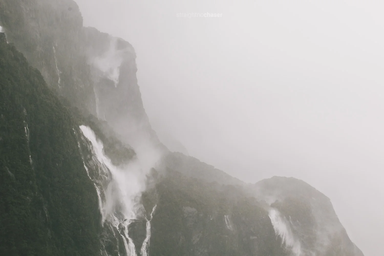 Rain, fog, and waterfalls in Milford Sounds New Zealand